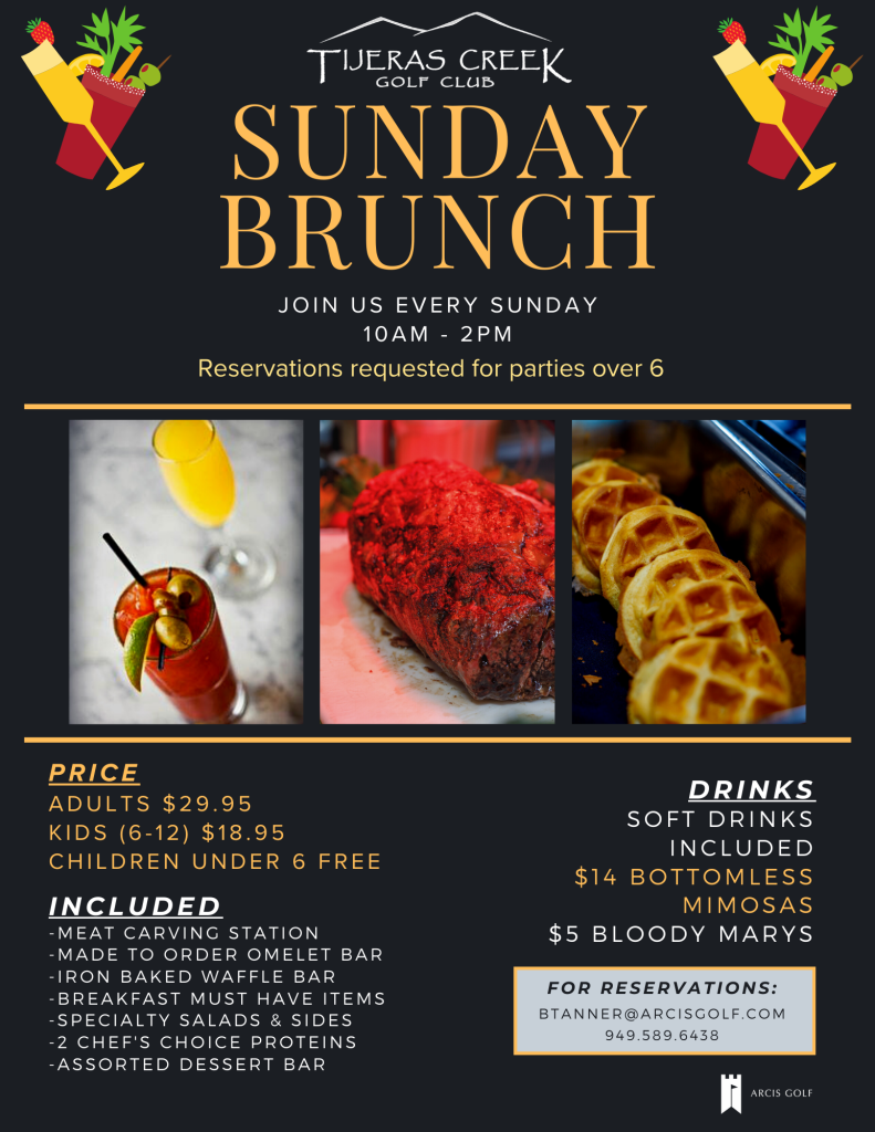 TJ’s Tap & Table at Tijeras Creek Golf Club takes pride in its commitment to providing excellent service, quality food at a amazing price for our Sunday Brunch. Enjoying a mimosa overlooking the golf course…Sound nice? Come on down and experience it for yourself.