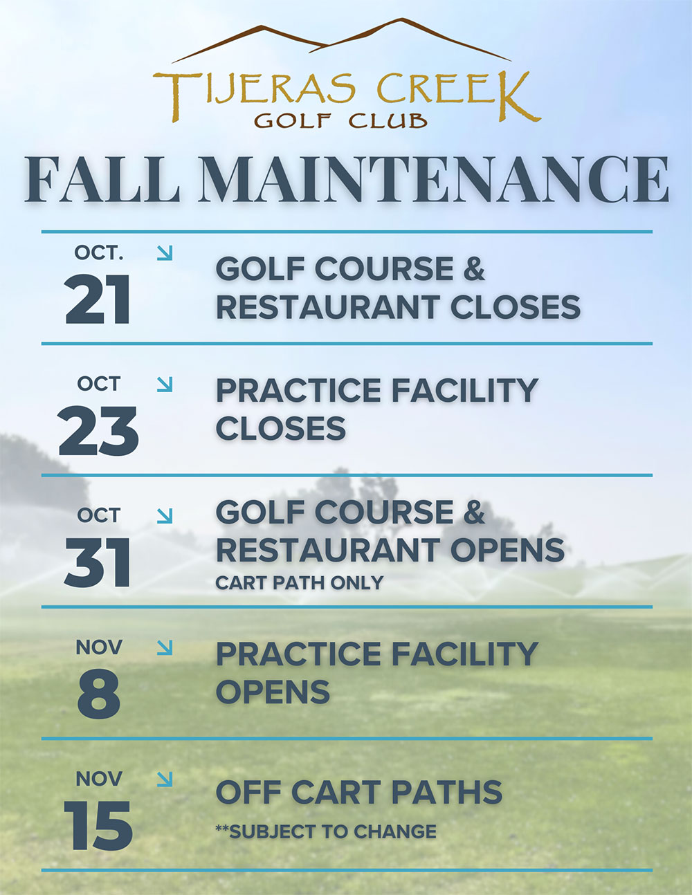 Below is our 2024 Fall Maintenance schedule, course overseed, and green aerification.