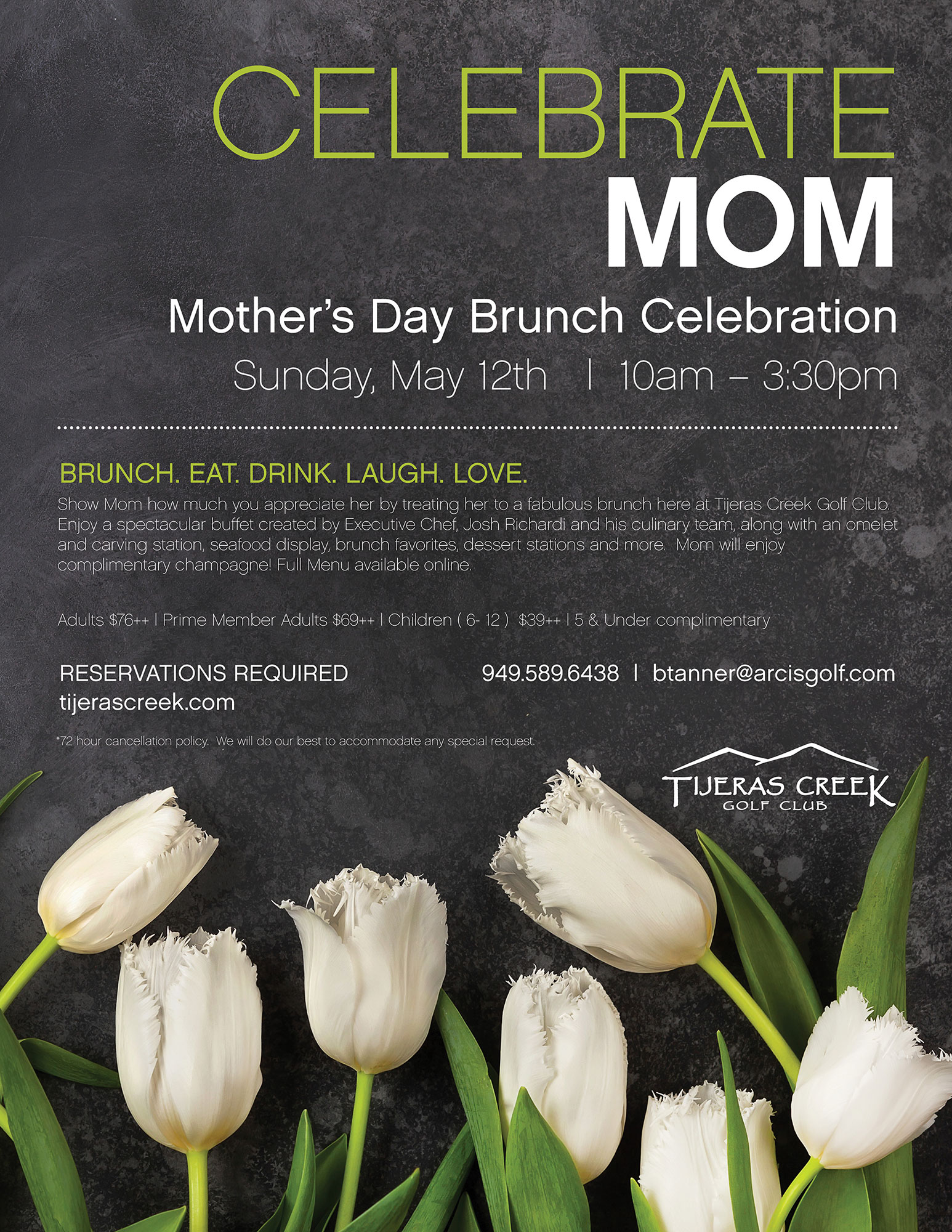 Show Mom how much you appreciate her by treating her to a fabulous brunch here at Tijeras Creek Golf Club. Enjoy a spectacular buffet created by Executive Chef Josh Richard and his culinary team, along with an omelet and carving station, seafood display, brunch favorites, dessert stations, and more. Mom will enjoy complimentary champagne! View the full menu listed below.